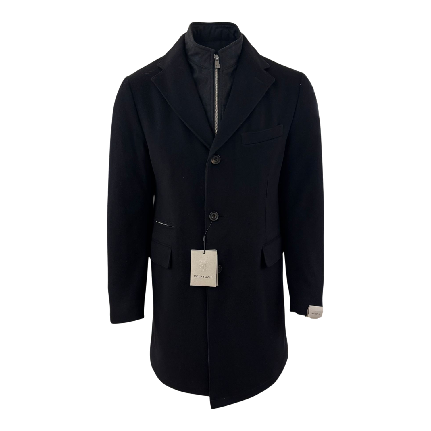Zuiver wollen coat/ jas van Corneliani uit Italie met een uitritsbare front.