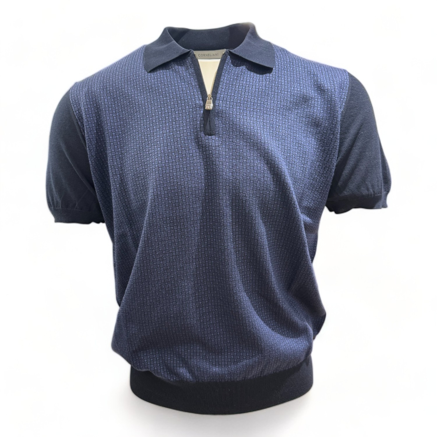 Zippolo van Corneliani uit Italie, met 80% katoen en 20% zijde. Kwaliteit is zeer comfortabel in dragen.